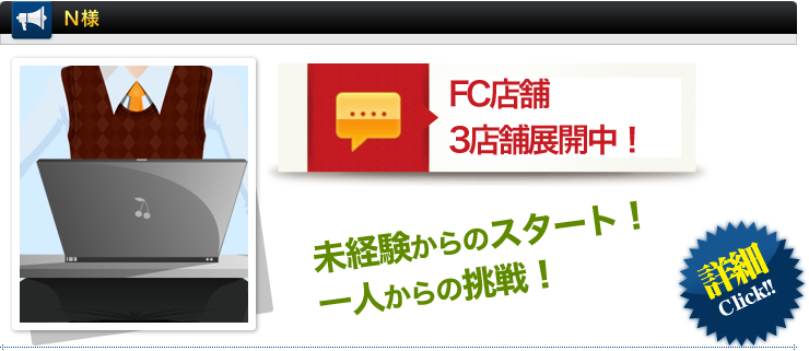 | 業種にこだわらずFC加盟募集の職種を探していましたところ 知人に紹介を頂き、説明会に参加して詳しく契約内容をお伺いして 関東でも大きなグループのヒップスグループでフランチャイズ加盟を 決めました。 | |